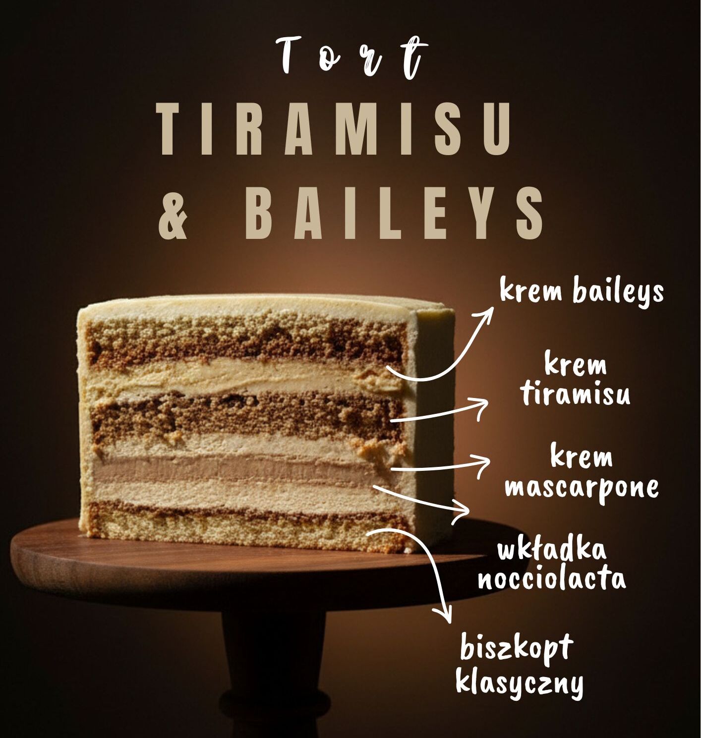 Krem tiramisu na bazie jajek wnosi charakterystyczną dla tiramisu głębię, a krem Baileys dodaje subtelnej słodyczy i deserowej kremowości. Wkładka Nocciolata wprowadza intensywną, orzechowo-czekoladową nutę, która pięknie przełamuje całość, a krem mascarpone domyka tort miękką, delikatną strukturą.